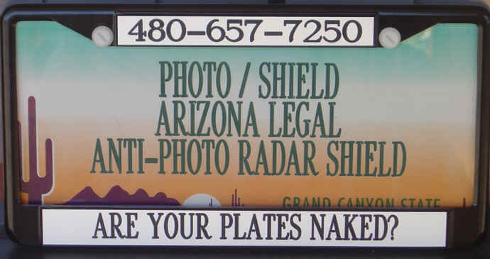 Photo/Shield'sâ almost invisible Stealth Technology reflective coating, which is clearly legible and 100% Arizona Legal, is the perfect anti-roadside photo radar shield. When the roadside Van's strobe lights flashes hits Photo/Shield'sâ plate, our special coating smears the photos negative and renders it useless.